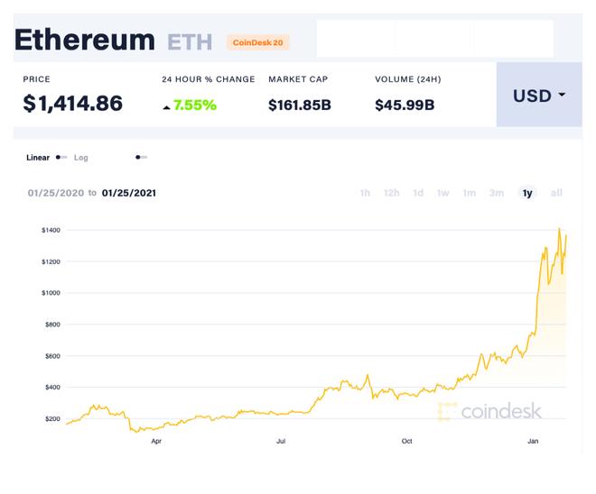 Theo Coindesk, giá Ether hôm 25/1 (theo giờ Việt Nam) đã chạm mức kỷ lục 1.476 USD/ETH rồi quay đầu giảm nhẹ xuống ngưỡng 1.400 USD/ETH, tăng 7,55% so với một ngày trước đó. Tính từ ngày 1/1 đến nay, đồng tiền này tăng giá trị 97,21%.