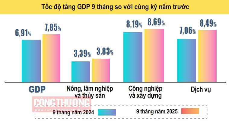 Cùng với đó, giá trị tăng thêm toàn ngành công nghiệp 9 tháng năm 2025 tăng 8,55% so với cùng kỳ năm trước, đóng góp 35,06% vào tốc độ tăng tổng giá trị tăng thêm toàn nền kinh tế. Công nghiệp chế biến, chế tạo là động lực tăng trưởng với tốc độ tăng 9,92%, đóng góp 31,73%; Ngành xây dựng tăng 9,33%, đóng góp 7,99%. Ngoài ra, ngành dịch vụ cũng tiếp tục tăng trưởng tích cực khi nhu cầu tiêu dùng hàng hóa, dịch vụ, du lịch trong nước tăng mạnh, đặc biệt trong thời gian diễn ra các ngày lễ lớn của dân tộc đã đóng góp tích cực vào tăng trưởng của ngành thương mại dịch vụ. Theo đó, giá trị tăng thêm khu vực dịch vụ 9 tháng năm 2025 tăng 8,49% so với cùng kỳ năm trước, chỉ thấp hơn mức tăng 11,37% của cùng kỳ năm 2022 trong giai đoạn 2011-2025.