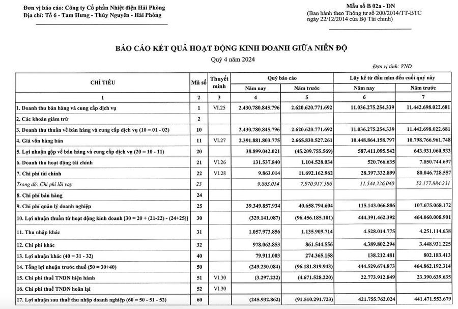 Tính chung cả năm 2024, Nhiệt điện Hải Phòng ghi nhận 11.036 tỷ đồng doanh thu thuần và lãi sau thuế gần 422 tỷ đồng, cùng giảm khoảng 4% so với năm 2023.