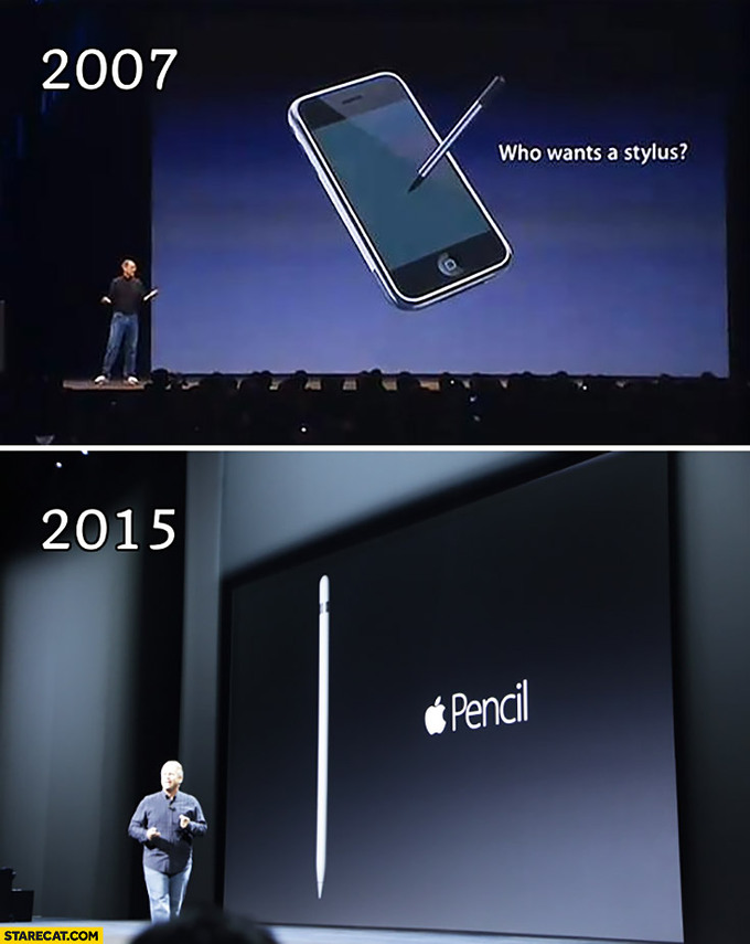 Sinh thời, Steve Jobs ghét tất cả sản phẩm không thể trải nghiệm trực tiếp trên màn hình. Chính những trải nghiệm sống động từ ngón tay người lên màn hình điện thoại đã đưa tên tuổi của Apple lên tầm cao mới. Vì vậy, vào thời thịnh hành của bút cảm ứng, ông vẫn khăng khăng từ chối phụ kiện này với câu nói kinh điển: "Ai cần bút cảm ứng?"