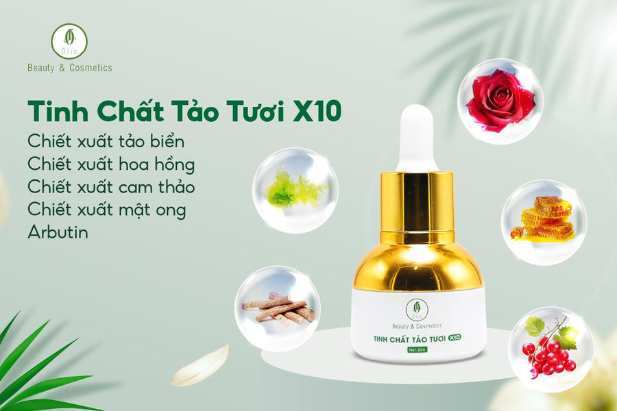 Tinh chất Tảo tươi X10 với thành phần đều là những nguyên liệu nhập khẩu hàng đầu trong việc tái tạo, phục hồi làn da giúp da dày, khỏe hơn, đồng thời làm mờ thâm sạm, nám, tàn nhang hiệu quả nhờ các sản phẩm chiết xuất tảo biển, hoa hồng, cam thảo, mật ong, Arbutin.
