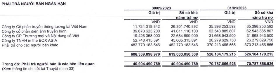 Trong nợ ngắn hạn, khoản phải trả ngắn hạn chiếm tỷ trọng cao nhất với 606,3 tỷ đồng, chiếm hơn 31%. Bao gồm khoản phải trả cho Công ty TNHH In the BOX ASIA khoản trị giá 52,7 tỷ đồng, Công ty cổ phần Điện ảnh Truyền hình (39,6 tỷ đồng), Công ty cổ phần Thương mại và Nội dung Số Việt (19,4 tỷ đồng), Công ty cổ phần Truyền thông Tương lai Việt Nam (11,7 tỷ đồng) và các bên khác.