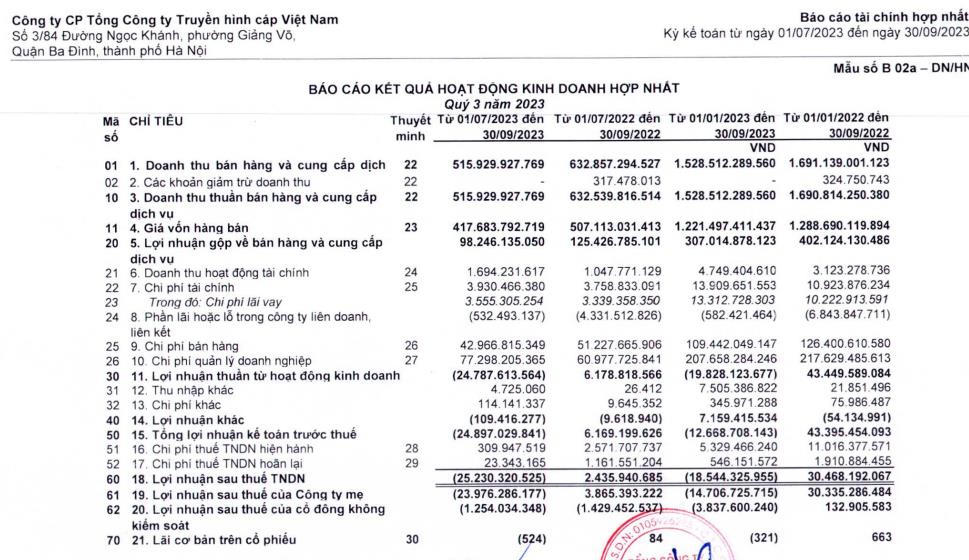 Theo Báo cáo tài chính hợp nhất quý III/2023, doanh thu thuần của Công ty cổ phần Tổng công ty Truyền hình cáp Việt Nam (VTV Cab, mã ck: CAB) ghi nhận doanh thu thuần đạt 515,9 tỷ đồng, giảm 18,4% so với cùng kỳ năm ngoái.
