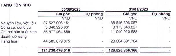 Hàng tồn kho tăng mạnh 35,7% lên mức 171,7 tỷ đồng, chiếm phần nhiều là nguyên liệu, vật liệu (87,5 tỷ đồng); tiếp đến là hàng hóa tồn 44,5 tỷ đồng; chi phí sản xuất kinh doanh dở dang là 36,5 tỷ đồng.