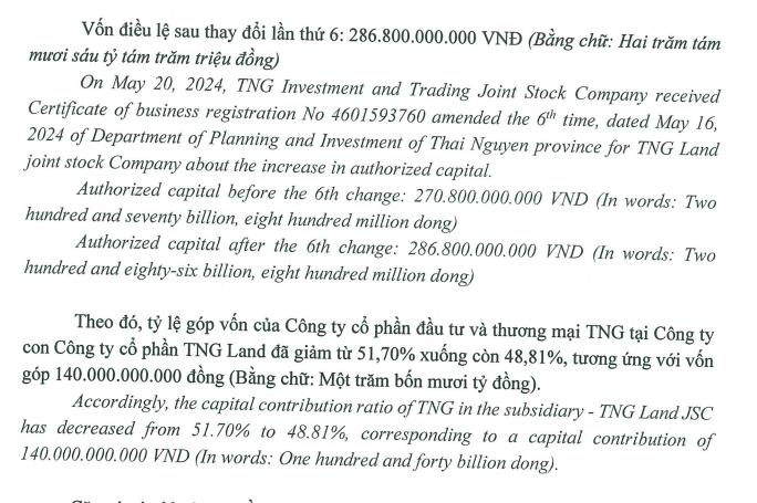 Theo đó, TNG Land tăng vốn từ gần 271 tỷ đồng lên gần 287 tỷ đồng.