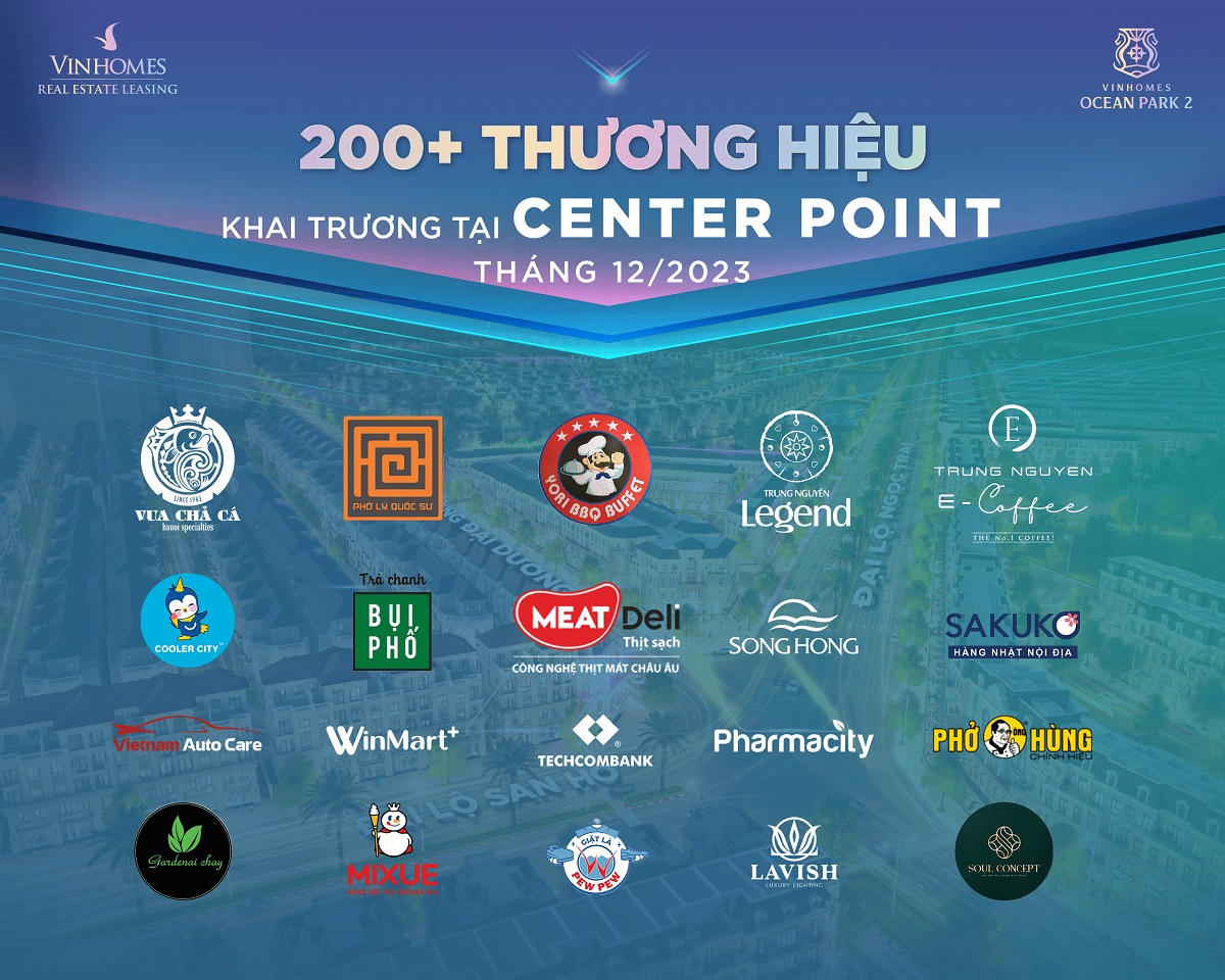 Chỉ sau 1 tháng chào thuê, Center Point đã thu hút hơn 200 thương hiệu, đạt tỷ lệ lấp đầy 100% với nhiều lĩnh vực như dịch vụ, F&B, bán lẻ, thời trang... Loạt thương hiệu uy tín quy tụ tại đây phải kể đến Ngân hàng Techcombank, Trung Nguyên E-Coffee, nhà hàng Yori BBQ Buffet, nhà hàng Vua Chả Cá, phở Lý Quốc Sư, thương hiệu Meat Deli, siêu thị Winmart+, trà sữa Đài Loan Mixue, nhà thuốc Pharmacity…