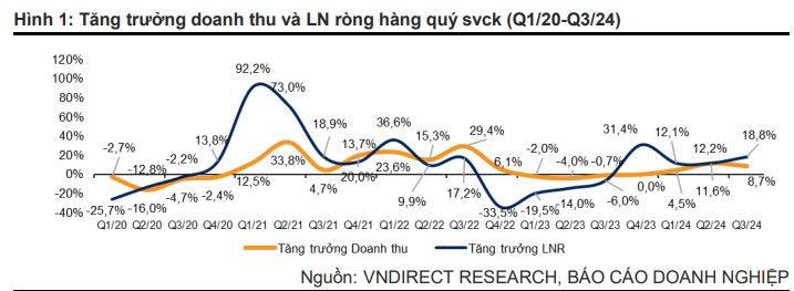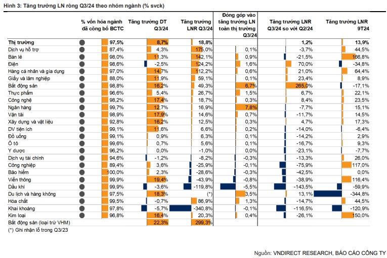 VNDirect ước tính tăng trưởng lợi nhuận toàn thị trường quý 3/2024 đạt mức 18,8% so với cùng kỳ, chủ yếu do nền thấp trong quý 3/2023.