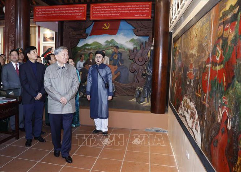 Ngay sau lễ dâng hương, Tổng Bí thư Tô Lâm cùng Đoàn đại biểu đã tham quan khu trưng bày tư liệu, hiện vật, Nhà lưu niệm - nơi gắn bó những năm tháng tuổi thơ của Tổng Bí thư Nguyễn Văn Cừ.