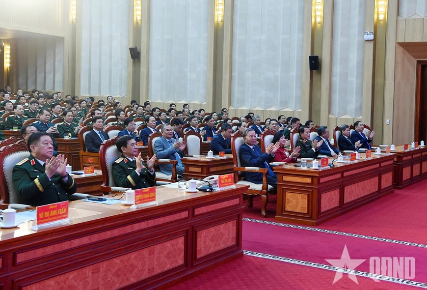 Tổng Bí thư Tô Lâm, Bí thư Quân ủy Trung ương dự và phát biểu chỉ đạo tại buổi lễ.