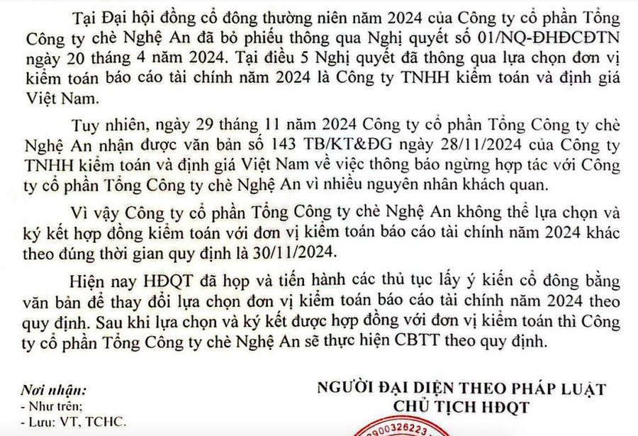 Cụ thể, doanh nghiệp cho biết, tại Đại hội thường niên diễn ra hồi tháng 4/2024, công ty đã chọn VAE kiểm toán báo cáo tài chính năm 2024 nhưng đến ngày 29/11 vừa qua, đơn vị này đã gửi thông báo ngừng hợp tác với Công ty chè Nghệ An.