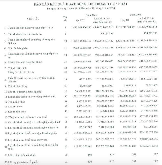 Lũy kế 9 tháng đầu năm, công ty ghi nhận doanh thu thuần đạt 4.063 tỷ đồng, giảm 2,14% so với cùng kỳ năm ngoái. Lợi nhuận sau thuế đạt 519,8 tỷ đồng, giảm nhẹ so với cùng kỳ năm ngoái.