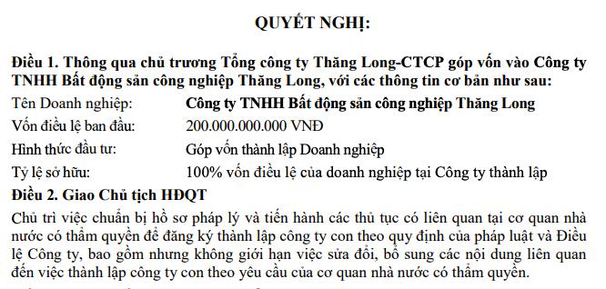 Tổng Công ty Thăng Long - CTCP (mã ck: TTL) vừa công bố Nghị quyết của Hội đồng quản trị về việc thông qua chủ trương thành lập thêm công ty con.