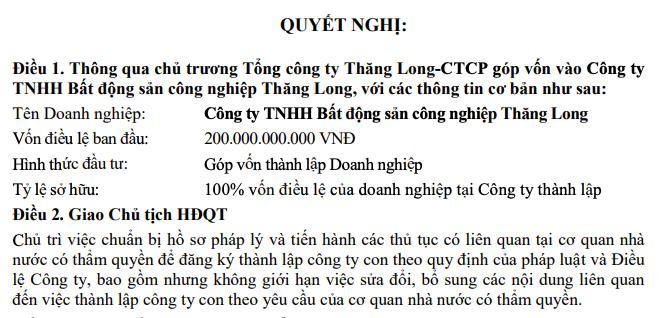 Cụ thể, doanh nghiệp mới thành lập có tên là Công ty TNHH Bất động sản công nghiệp Thăng Long, vốn điều lệ ban đầu 200 tỷ đồng, do Tổng Công ty Thăng Long sở hữu 100% vốn điều lệ.