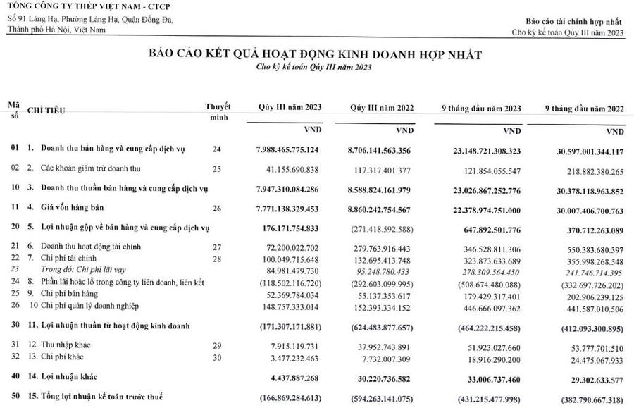 Báo cáo tài chính hợp nhất quý III/2023 của Tổng công ty Thép Việt Nam - Công ty cổ phần (VNSteel - mã ck: TVN) ghi nhận doanh thu thuần đạt 7.947 tỷ đồng, giảm 7% so với cùng kỳ năm trước.