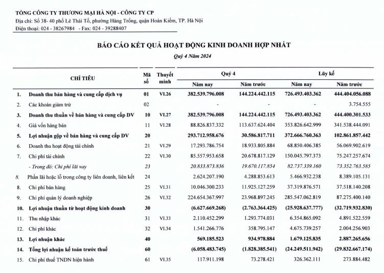 Tính chung cả năm 2024, doanh thu của Hapro đạt 726,5 tỷ đồng, tăng 63,5% so với năm 2023. Tuy nhiên công ty vẫn lỗ sau thuế 24,6 tỷ đồng, giảm 18,3% so với khoản lỗ 30,1 tỷ đồng của cùng kỳ.