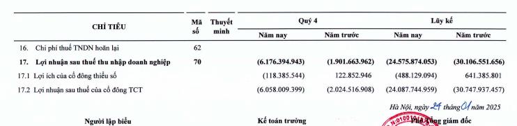 Trong đó, chi phí tài chính tăng gấp 4 lần lên 85,6 tỷ đồng, chi phí quản lý doanh nghiệp tăng gấp 9 lần lên 224 tỷ đồng. Khấu trừ giá vốn, chi phí, công ty lỗ sau thuế 6,2 tỷ đồng, tăng so với khoản lỗ 1,9 tỷ đồng của quý IV/2023.