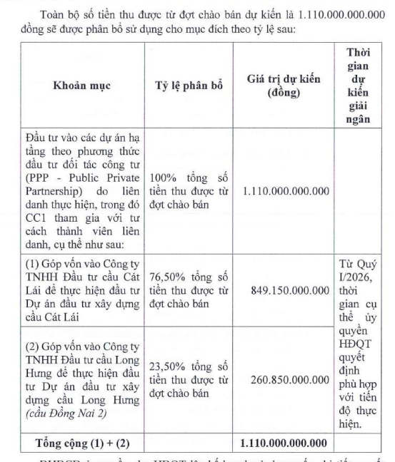 Cụ thể, theo kế hoạch, CC1 dự kiến giải ngân hơn 849 tỷ đồng, tương đương khoảng 76% số vốn huy động, để góp vốn thực hiện dự án cầu Cát Lái - công trình có tổng mức đầu tư khoảng 18.000 tỷ đồng. Phần còn lại, gần 261 tỷ đồng dự kiến được sử dụng cho dự án cầu Long Hưng (Đồng Nai 2). Dự án này có tổng mức đầu tư khoảng 11.000 tỷ đồng.