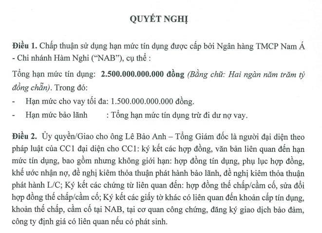 Trước đó ngày 2/12, CC1 cũng đã công bố Nghị quyết về chấp thuận việc vay vốn BIDV - chi nhánh TP.HCM với tổng hạn mức tín dụng lên đến 6.000 tỷ đồng. Trong đó, hạn mức vay, bảo lãnh thanh toán và L/C tối đa 2.000 tỷ đồng.