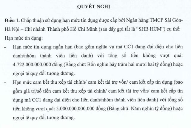 CC1 được Ngân hàng SHB chi nhánh TPHCM và ngân hàng Agribank chi nhánh Hà Nội cấp hạn mức tín dụng ngắn hạn, cam kết thu xếp tài chính, cam kết tài trợ vốn... là hơn 11.000 tỷ đồng.