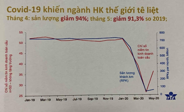 Cũng theo số lượng của IATA, tổng sản lượng của ngành hàng không trong tháng 4 giảm 94% so với cùng kỳ 2019, sang tháng 5 mặc dù có sự hồi phục nhẹ nhưng vẫn giảm 91,3% so với năm 2019.