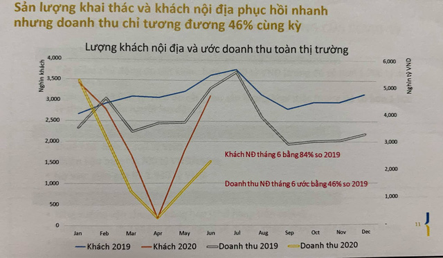 Mặc dù thị trường nội địa hồi phục, tuy nhiên tổng sản lượng và cung ứng nói chung so với cùng kỳ năm trước vẫn giảm một nửa. Số lượng khách giảm 34% nhưng phần lớn là khách đường ngắn giá rẻ kích cầu, do đó so với sản lượng gốc giảm 53%. Vì một đường Châu Âu bằng mười mấy lần đường nội địa, và doanh thu cả hàng hoá và hành khách từ 100.000 tỷ giảm còn 50.000 tỷ, nếu không có những biện pháp mạnh và kịp thời thì con số lỗ có thể lên đến 20.000 tỷ.