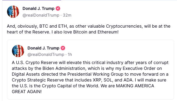 Trong bài đăng trên mạng xã hội, ông Trump cho biết sắc lệnh hành pháp được ký hồi tháng 1 của ông về tài sản kỹ thuật số đã chỉ đạo "Nhóm Công tác Tổng thống tiến hành thành lập Dự trữ Chiến lược Tiền điện tử bao gồm XRP, SOL và ADA." Ông nhấn mạnh: "Tôi sẽ đảm bảo Hoa Kỳ trở thành Thủ đô Tiền điện tử của Thế giới."