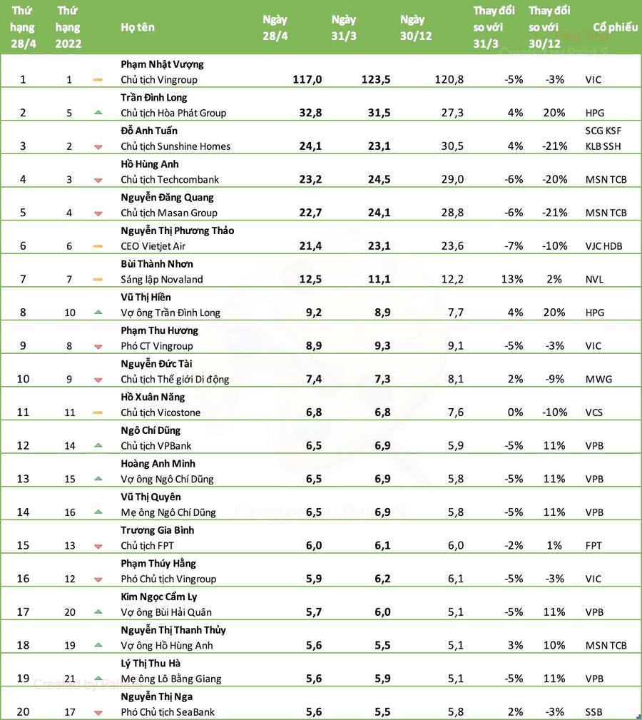 Tại ngày 28/4/2023, top 20 người giàu nhất sàn giao dịch sở hữu tổng tài sản 340.000 tỷ đồng, giảm hơn 9.000 tỷ đồng sau một tháng và giảm 15.000 tỷ đồng so với con số cuối thời điểm cuối năm 2022.