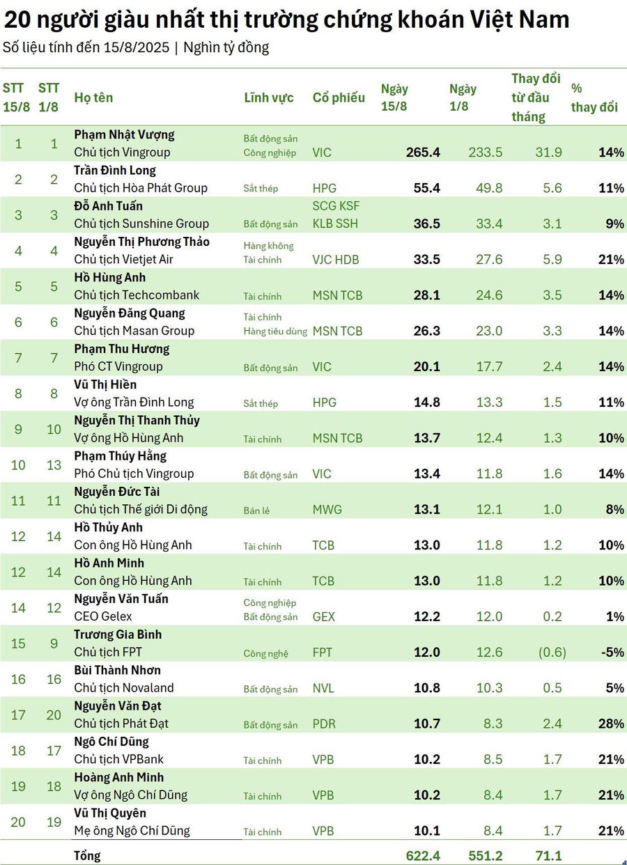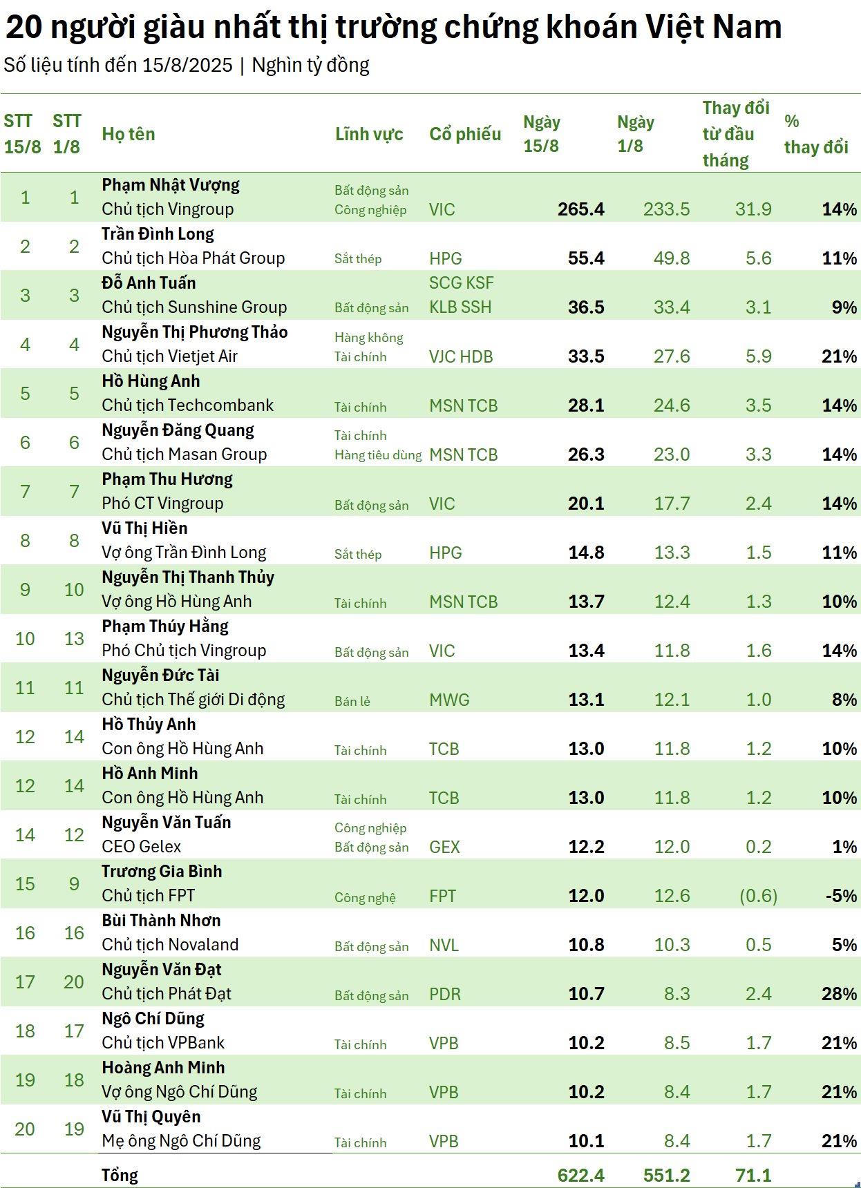 Tính đến ngày 15/8/2025, khối tài sản của 20 người giàu nhất sàn chứng khoán Việt Nam tăng thêm 71.100 tỷ đồng chỉ trong 1 tuần, lên mức 622.400 tỷ đồng.