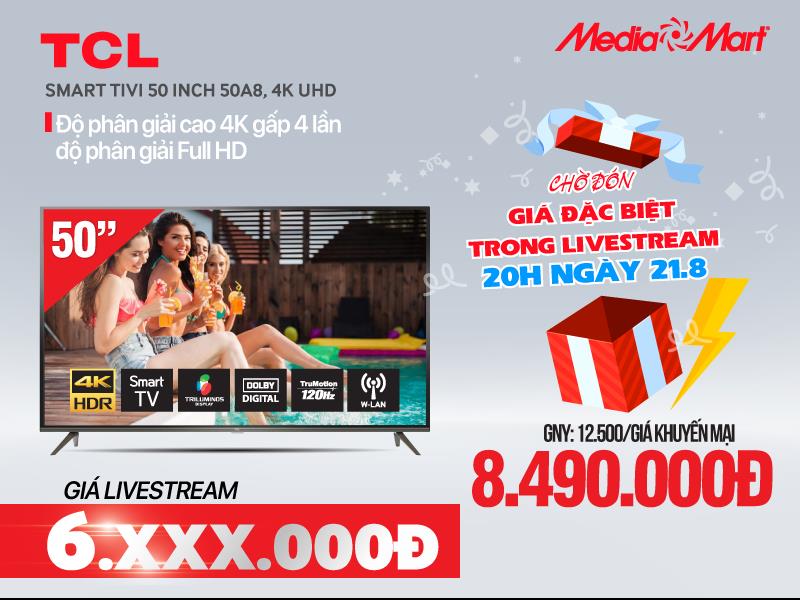 Dù mức giá hiện tại khá hấp dẫn nhưng trong livestream tại fanpage Điện máy MediaMart vào 20h ngày 21/8, với sự góp mặt của NSND – Diễn viên Tự Long thì những mẫu Tivi TCL này sẽ còn được giảm thêm từ 1 triệu đến 3 triệu đồng cho mỗi model. Theo đó, chỉ cần theo dõi livestream, người xem sẽ có thể săn Smart Tivi 4K 50’’ với giá chỉ 6,x triệu và nhận ngay các MÃ GIẢM GIÁ 1 triệu, 2 triệu, 3 triệu để mua sắm.