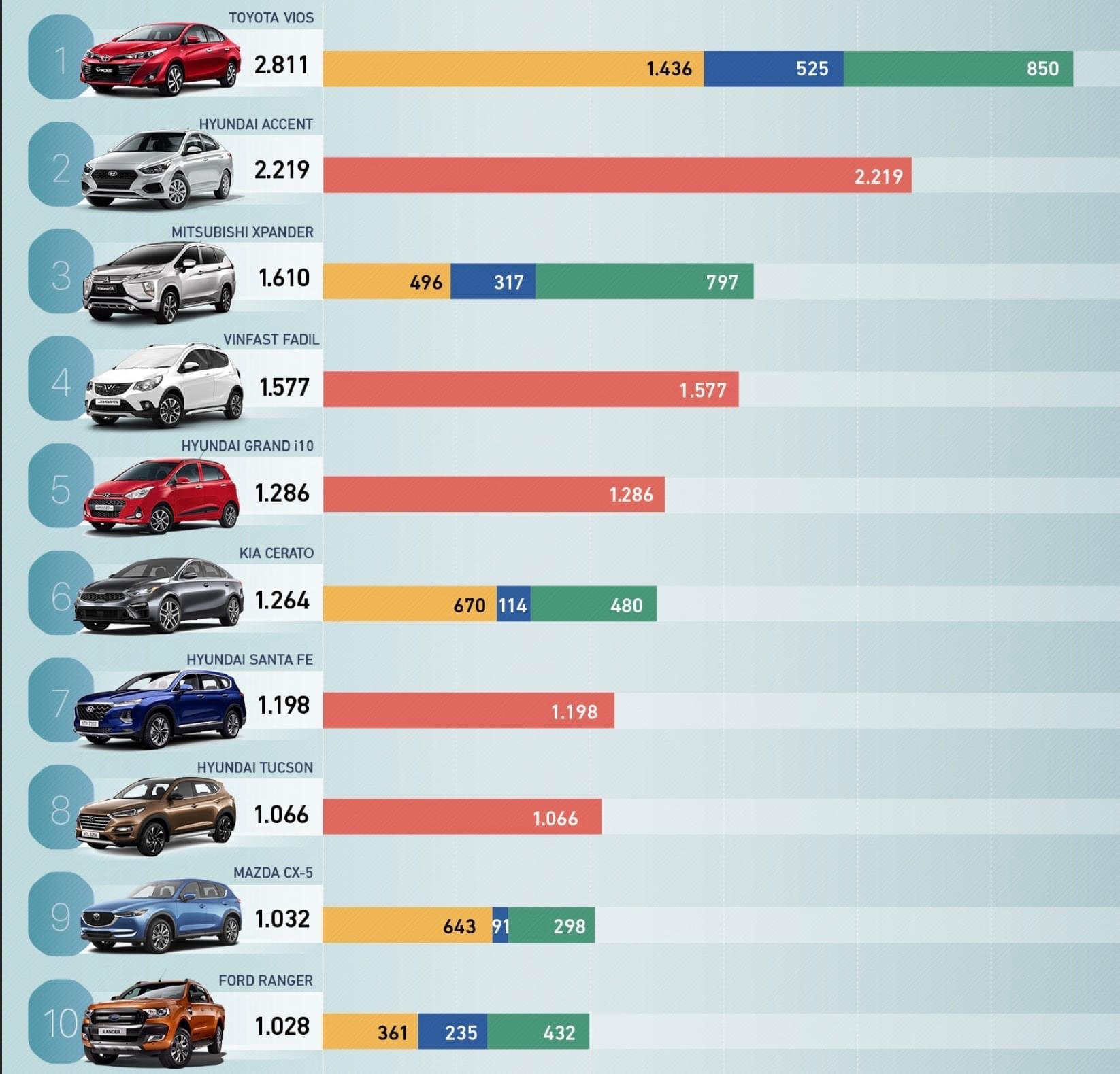 Ấn tượng hơn cả có lẽ thuộc về Toyota Vios khi hãng này công bố đã bán được 2.811 chiếc. Đây vốn là dòng xe gia đình, chạy dịch vụ được ưa chuộng bởi tính năng bền xe, ít xuống giá. Trong khi đó, đối thủ cùng phân khúc là Honda City lại rời top 10.