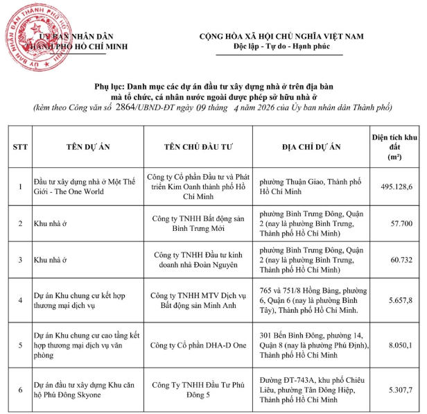 UBND TP HCM vừa ban hành danh mục 6 dự án đầu tư xây dựng nhà ở trên địa bàn mà tổ chức, cá nhân nước ngoài được phép sở hữu, nhằm thực hiện quy định tại Nghị định số 95/2024/NĐ-CP của Chính phủ, góp phần minh bạch hóa thông tin thị trường và tạo điều kiện để nhà đầu tư quốc tế tiếp cận các dự án đủ điều kiện pháp lý.