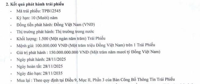 Theo đó, vào ngày 28/11/2025, TPBank đã phát hành 1.500 trái phiếu mã TPB12545. Mỗi trái phiếu có mệnh giá 100 triệu đồng, qua đó giá trị phát hành là 150 tỷ đồng.