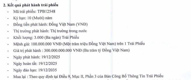 Ngày 19/12/2025, TPBank đã phát hành 3.000 trái phiếu có mã TPB12548. Mỗi trái phiếu có mệnh giá 100 triệu đồng, qua đó giá trị phát hành là 300 tỷ đồng.