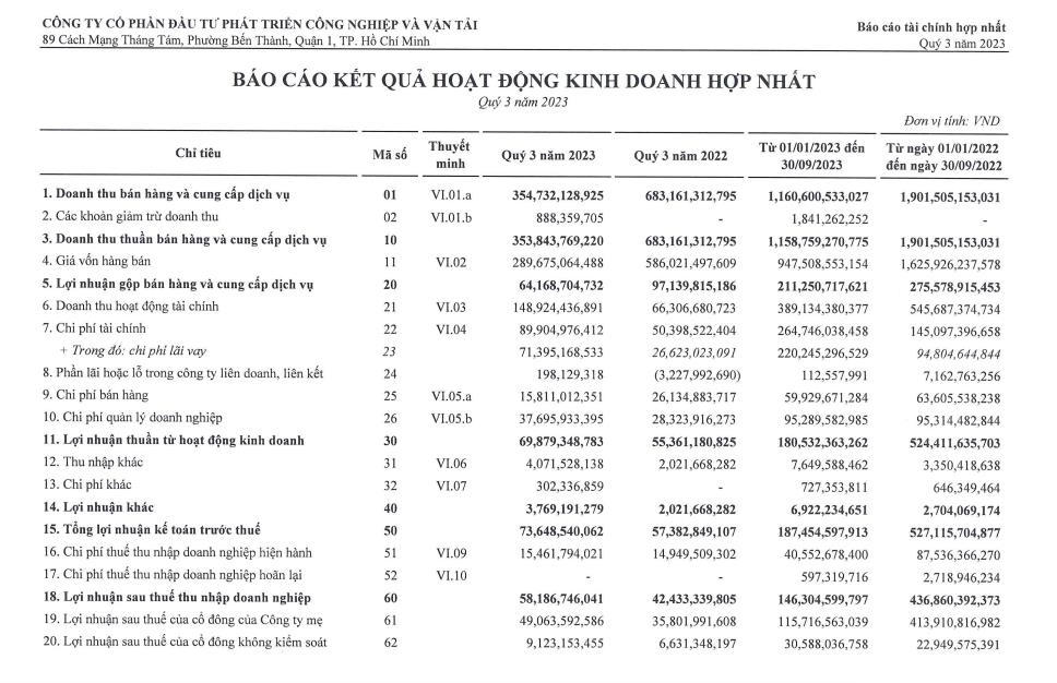 Theo báo cáo tài chính quý III/2023 mà Công ty cổ phần Đầu tư Phát triển Công nghiệp và Vận tải (Tracodi, mã ck: TCD) vừa công bố, công ty ghi nhận 353,8 tỷ đồng doanh thu thuần trong quý III, giảm 48,2% so với cùng kỳ.