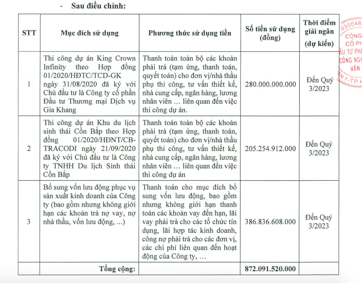 Sau điều chỉnh, Công ty sẽ dùng 280 tỷ đồng để thanh toán các khoản phải trả liên quan đến việc thi công dự án King Crown Infinity (giảm gần 1/2 so với 530 tỷ đồng kế hoạch cũ); 205 tỷ đồng để thi công dự án Hội An D'or (giảm hơn so với hơn 342 tỷ đồng kế hoạch cũ). Thời điểm giải ngân điều chỉnh thành đến quý III/2023 trong khi kế hoạch cũ là quý IV/2021 và năm 2022).