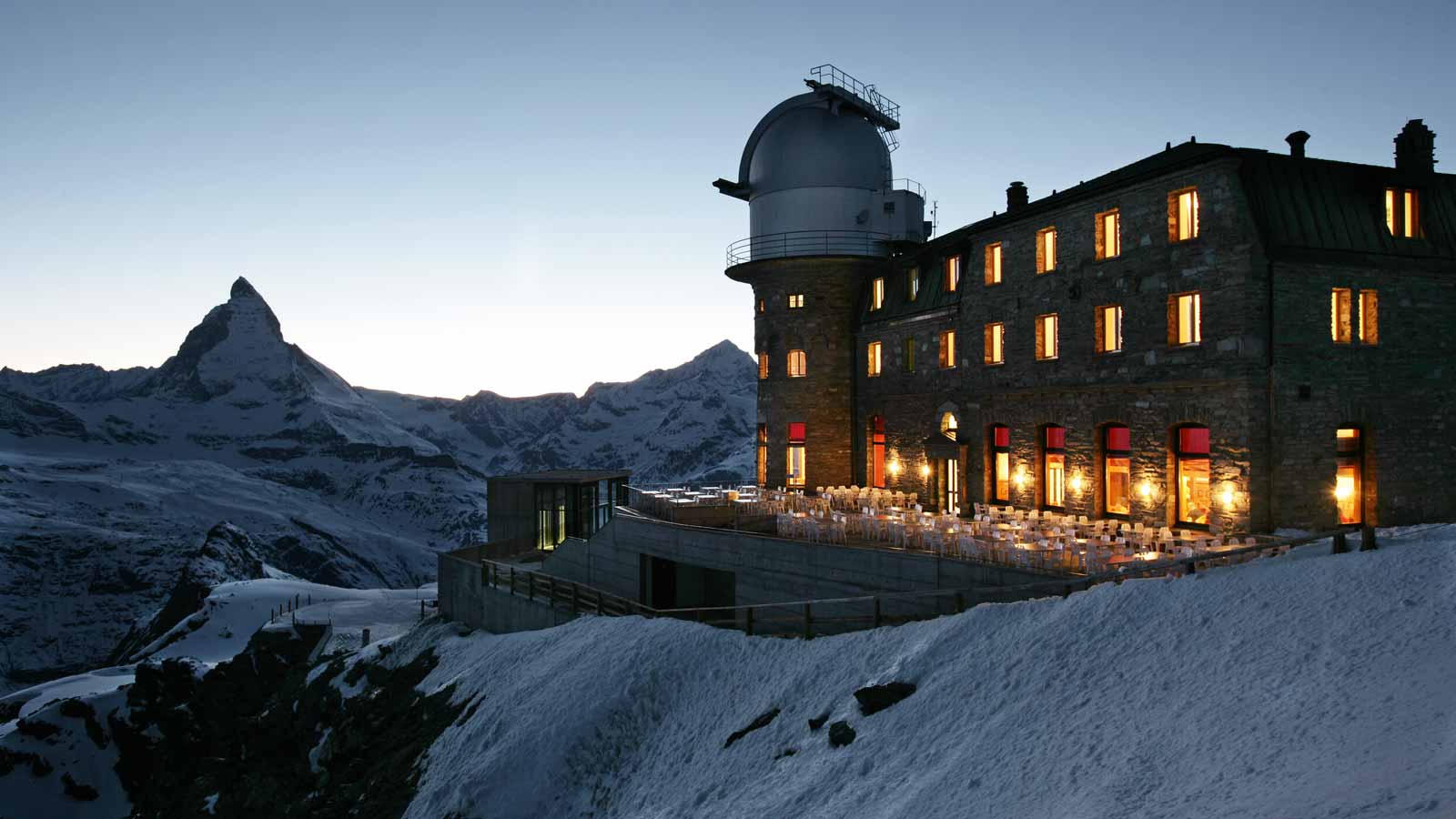 Bất kì ai cũng sẽ phải xuýt xoa khi nhìn ngắm khách sạn Kulmhotel Gornergrat chơ vơ ở độ cao hơn 3.000m thuộc dãy Alps trắng xóa, Thụy Sĩ vốn chẳng khác gì một bối cảnh phim về siêu điệp viên 007. Tọa lạc trên đỉnh Gornergrat hơn 100 năm qua, khách sạn lâu đời này sở hữu 22 phòng nghỉ với tầm nhìn ngoạn mục ra 2 ngọn núi Matterhorn và Montblanc trước mặt, cùng 2 nhà hàng, thư viện, hàng hiên tắm nắng lẫn khu mua sắm tích hợp.