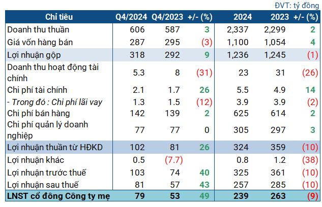 Trong quý IV/2024, Traphaco ghi nhận doanh thu đạt 606 tỷ đồng, tăng nhẹ so với cùng kỳ năm trước. Trong khi đó, giá vốn giảm, giúp lãi gộp của Công ty đạt 318 tỷ đồng, tăng 9%. Biên lãi gộp cải thiện từ 50% lên hơn 52%.