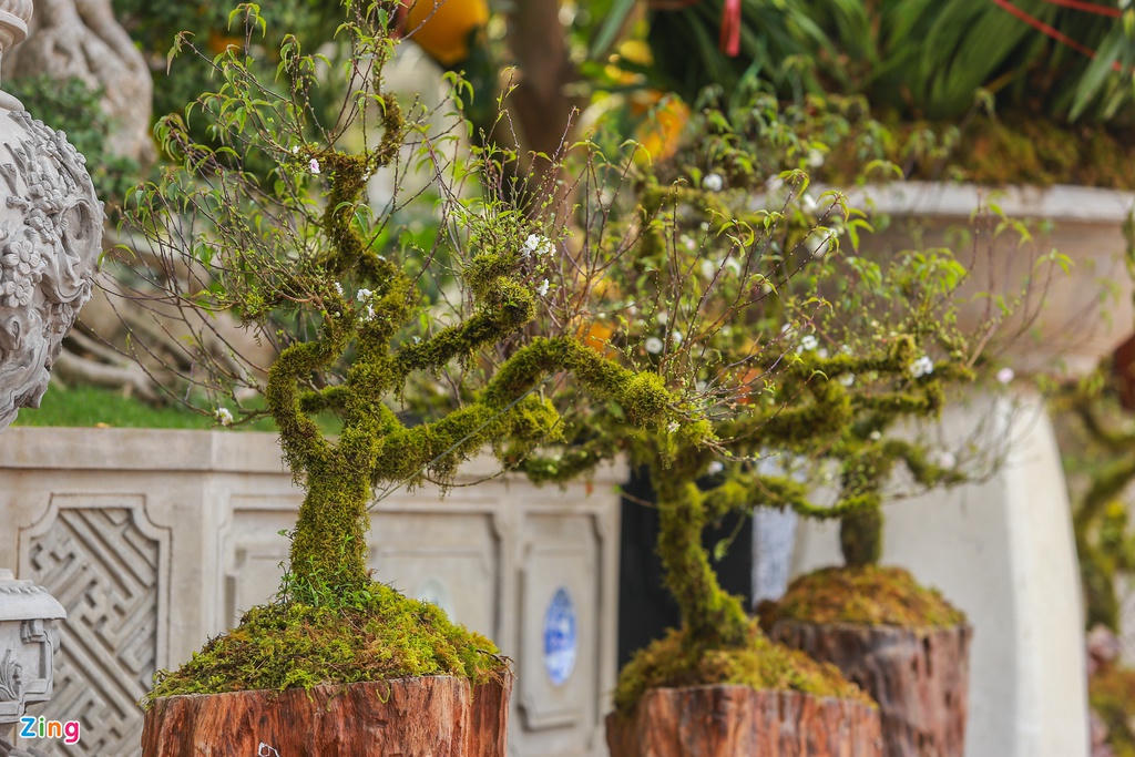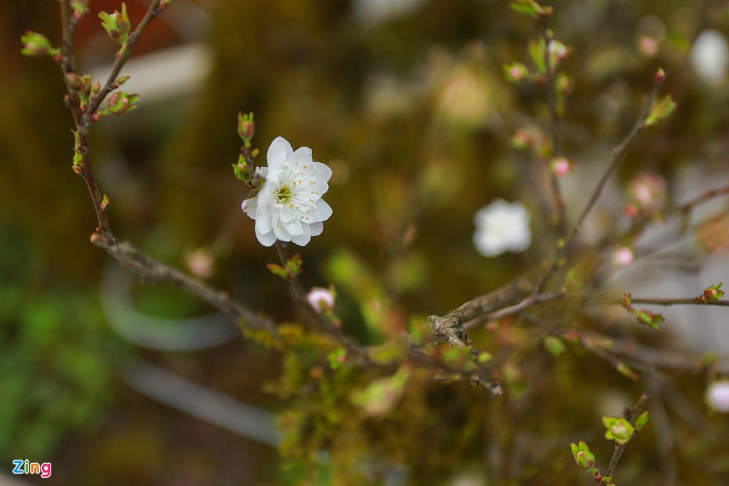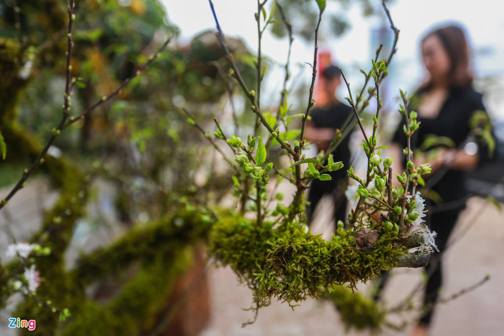Càng gần Tết Nguyên đán, thị trường cây cảnh ngày càng đa dạng. Chậu bích đào hình trâu ôm tiền vàng hay mai trắng Sa Pa bọc rêu là những sản phẩm mới lạ ở chợ hoa Hà Nội.