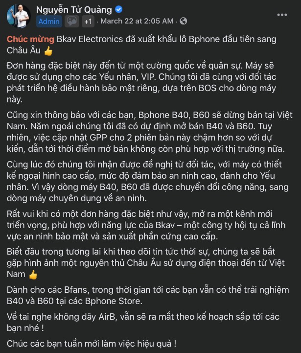 Khoảng thời gian sau khi Bphone B86 series lên kệ cũng là thời điểm mà ông Nguyễn Tử Quảng có những phát ngôn "gây sốc". Cụ thể, ông Quảng tuyên bố rằng Bphone B86 là chiếc điện thoại đầu tiên trên thế giới không có phím bấm vật lý, một tính năng được coi là đột phá trong ngành công nghệ điện thoại và là thiết kế tối giản, không có viền dưới, cũng như không có phím bấm vật lý. Camera của Bphone B86 cũng được ông Quảng mô tả là "2 camera như 5 camera", ứng dụng AI để cho chất lượng ảnh chụp vượt trội hơn các đối thủ khác trên thị trường. Ngoài ra, Bphone B86 còn là smartphone được chứng nhận chống nước theo một tiêu chuẩn do Bkav... tự nghĩ ra là "IP68+", vốn là một tiêu chuẩn không có thật, cũng như gặp vấn đề với các chứng chỉ của Google.