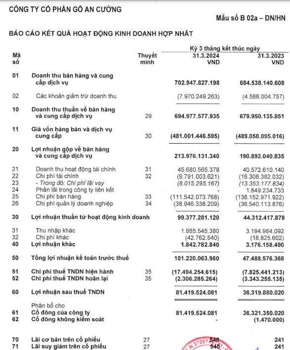 Theo báo cáo tài chính hợp nhất quý I/2024 của Công ty cổ phần Gỗ An Cường (mã ck: ACG), doanh thu thuần của ACG ghi nhận đạt 694,9 tỷ đồng, tăng 2,2% so với cùng kỳ.