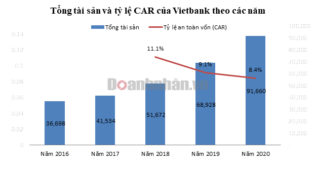 Tổng tài sản của Vietbank tăng lần lượt 24,4%, 33,4% và 33,0% trong giai đoạn 2018-2020. Trong khi đó, tốc độ tăng vốn tự có chưa tương xứng khiến tỷ lệ an toàn vốn giảm dần xuống sát mức quy định tối thiểu của NHNN (8%). Tại thời điểm 30/09/2020, tỷ lệ này chỉ còn 8,4%.