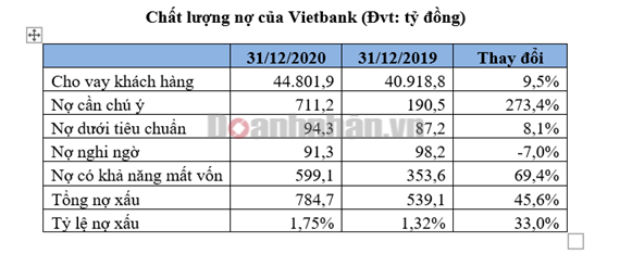 Quy mô nợ xấu của Vietbank đã tăng đáng kể 45,6% so với hồi đầu năm, trong đó nợ có khả năng mất vốn tăng mạnh nhất lên đến 69,4%. Đặc biệt, nợ cần chú ý (nhóm 2) cũng nhảy vọt từ 190,5 tỷ đồng đầu năm lên tới hơn 711,2 tỷ đồng vào cuối năm. Nợ nhóm 2 là các khoản nợ bắt đầu quá hạn, được xem là phần nợ xấu tiềm tàng mà các ngân hàng bắt đầu phải trích dự phòng.