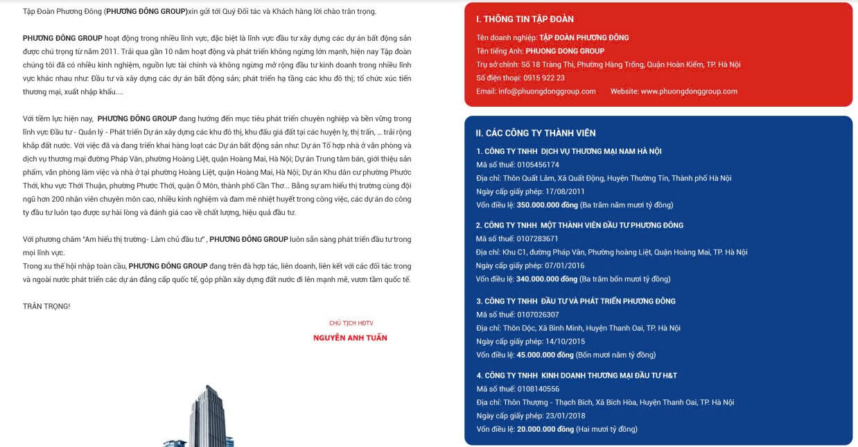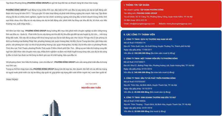Được biết, Chủ tịch của Phương Đông Group theo website tự giới thiệu cũng chính là ông Nguyễn Anh Tuấn. Ông Nguyễn Anh Tuấn chính là người đứng sau nắm các vị trí cấp cao tại Nam Hà Nội và Đầu tư Phương Đông.
