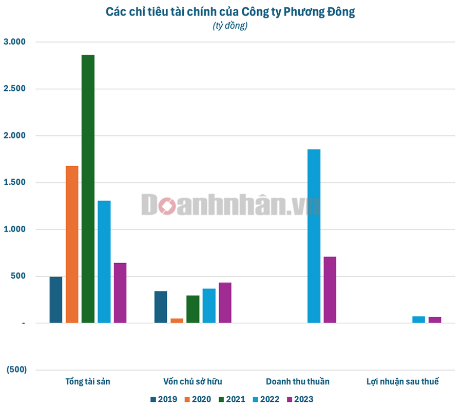 Giai đoạn đầu triển khai, Công ty Đầu tư Phương Đông không có doanh thu trong suốt 3 năm 2019-2021 dù quy mô tài sản tăng vọt. Đến năm 2022, doanh nghiệp này ghi nhận doanh thu đột biến hơn 1.850 tỷ đồng. Con số này giảm mạnh hơn 60% xuống còn 700 tỷ đồng vào năm 2023. Nguồn thu này khả năng đến từ việc mở bán dự án trên.
