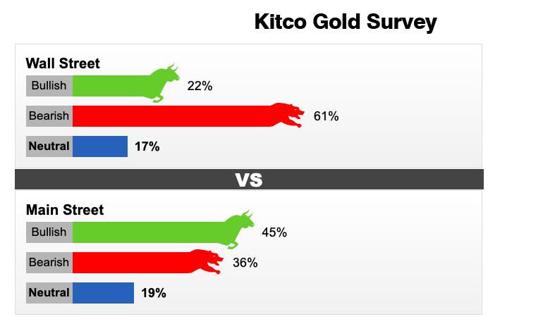 Kết quả khảo sát thị trường vàng tuần này của Kitco News cho thấy, các nhà phân tích Phố Wall phần lớn tỏ ra bi quan về vàng bởi tiềm năng chính sách tiền tệ dự báo thắt chặt hơn sẽ hỗ trợ đồng USD và đẩy lợi suất trái phiếu cao hơn. Đồng thời, tâm lý lạc quan của các nhà đầu tư bán lẻ ở Phố Main cũng chưa có gì thay đổi, vẫn ở mức thấp nhất trong 7 tháng.