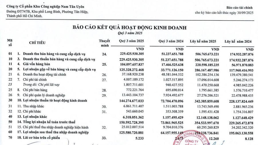 Trước thềm chào HOSE, Khu Công nghiệp Nam Tân Uyên (NTC) báo lãi gần gấp đôi trong quý III/2025