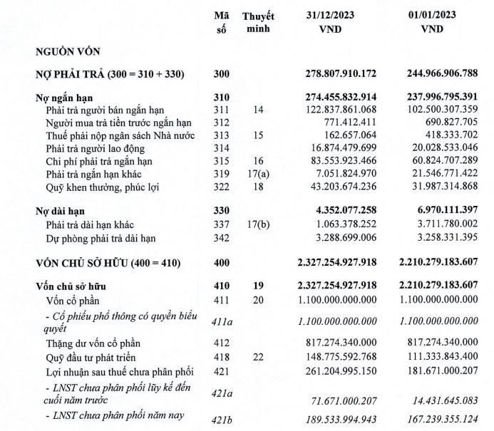 Xét về cơ cấu nguồn vốn, Mộc Châu Milk không ghi nhận nợ vay tài chính. Nợ phải trả của doanh nghiệp tại ngày 31/12/2023 tăng 14% so với hồi đầu năm lên 278,8 tỷ đồng, chủ yếu do khoản phải trả người bán ngắn hạn và chi phí phải trả ngắn hạn.
