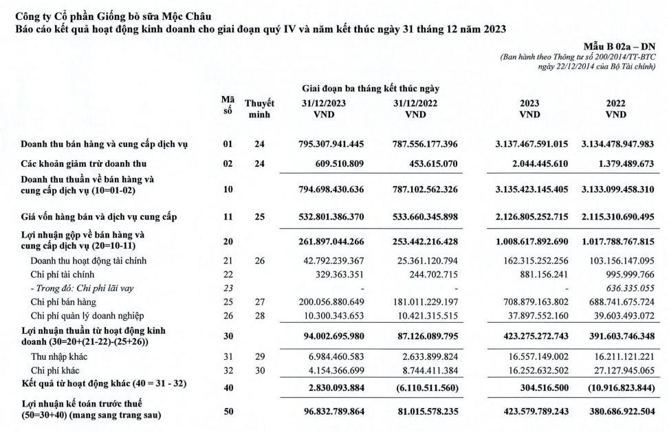 Công ty cổ phần Giống bò sữa Mộc Châu (Mộc Châu Milk - mã ck: MCM) vừa công bố báo cáo tài chính quý IV/2023.
