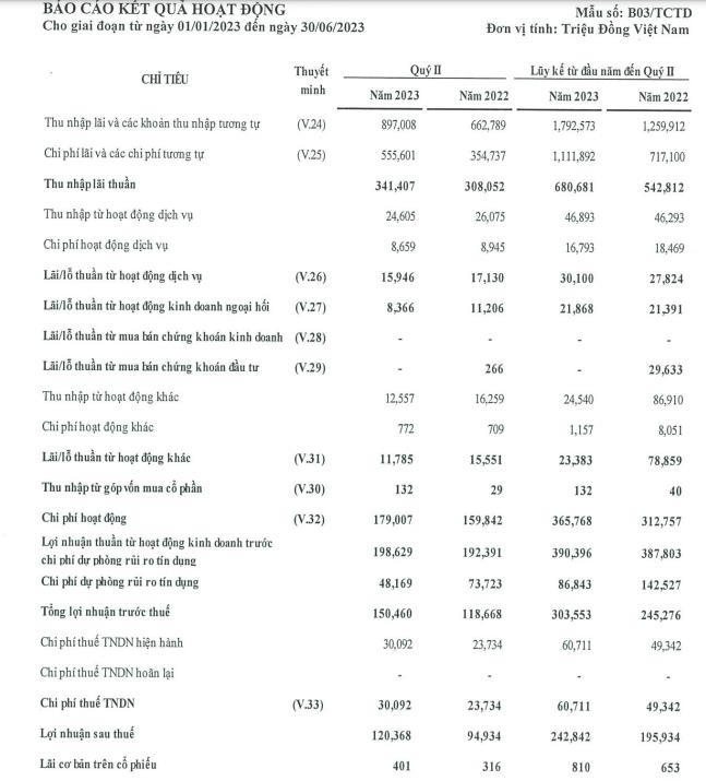 Về kết quả kinh doanh, quý II/2023, ngoại trừ thu nhập từ lãi thuần tăng trưởng 11%, đạt 341,4 tỷ đồng, các nguồn thu ngoài lãi khác của ngân hàng này đều giảm so cùng kỳ.