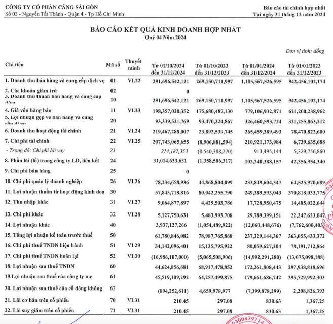 Về bức tranh tài chính, theo báo cáo kinh doanh hợp nhất quý IV/2024, trong quý cuối năm, Cảng Sài Gòn ghi nhận doanh thu thuần hợp nhất đạt 292 tỷ đồng, tăng 8,6% so với cùng kỳ năm 2023.